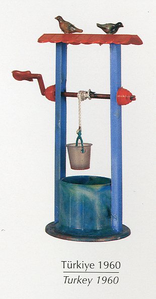 A miniature well with a very primitive mechanic winder. There are two birds standing on the edge of its narrow roof.