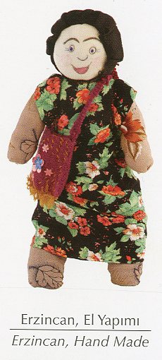 Folkloric, hand-made doll from Erzincan Region of Turkey. The body and clothes are made from floral fabric. She has a brick red vowen bag and simple illustrated face.